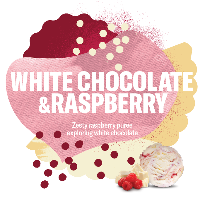 Milk, Cream (Milk), Liquid Sugar, Raspberry Ripple (10%) [Raspberries (40%), Sugar, Water, Glucose Syrup, Stabiliser (412, 415), Acidity Regulator (330), Flavour], White Chocolate Pieces (6%) [Sugar, Milk Solids, Cocoa Butter (21%), Emulsifier (Soy Lecithin), Flavour], Milk Solids, Glucose Syrup, Maltodextrin, Sugared Egg Yolk, Stabiliser (412, 415, 410, 407), Flavour.